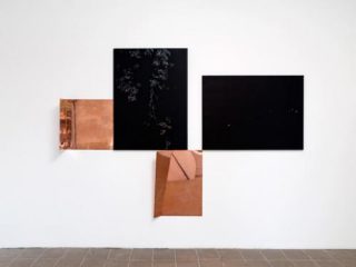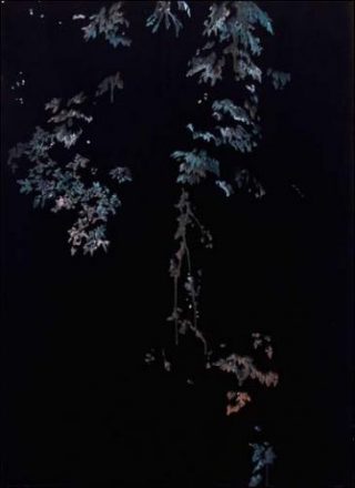 Peintures sombres et iridescentes mais aussi céramiques, cuivre gravé, dessins botaniques composent une scénographie intrigante. Les dessins, d’une précision naturaliste, révèlent une chorégraphie de lotus. Un papier peint habille le mur du fond reprenant des motifs textiles floraux de William Morris, également mis à l’oeuvre dans une peinture exposée plus loin. Des tableaux noirs s’articulent à des plaques de cuivre. Un paravent peint amène dans le second espace dans lequel se trouvent des éléments épars tels qu’une petite toile, une céramique ou encore un film Super 8.