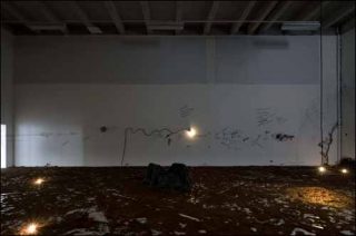Des percées violemment opérées à la masse sur les parois laissent apparaître les «entrailles» du bâtiment. Souillures et écritures s’étalent sur les murs comme les stigmates spatiaux et temporels. Les dates et les heures inscrites au marqueur permettent de reconstituer les phases de la construction de l’environnement par l’artiste.