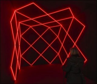 — François Morellet, 2 trames 45°-135° de néons interférents, 1972. Cabane en bois, tubes de néon rouges, 2 clignoteurs électroniques, commutateur. 360 °— 360 °— 360 cm