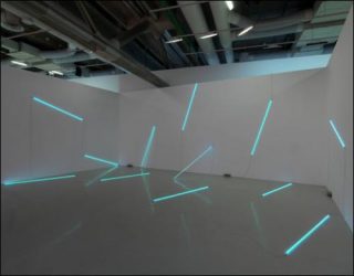 — François Morellet, No End Neon, 1990. Tubes de néon bleus disposés en quinconce sur 3 murs et le sol. Dimensions variables