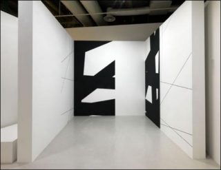 — François Morellet, 2 trames de parallèles inclinées à 30° et 40° sur 3 murs, 1977-2009. Ruban adhésif; installation in situ. Dimensions variables