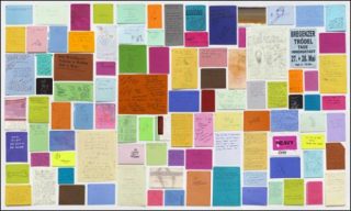 L’œuvre Bulletin Board apparaît quant à elle comme un vestige des compositions People are Overhearing Us et Conversations with the Hearing. En effet, Joseph Grigely a photographié à taille réelle une toile défaite: celle-ci demeure quasiment vide, parsemée de trous de punaise, et les papiers multicolores porteurs de messages ont été arrachés. Il n’en reste que quelques coins, çà et là , sous les agrafes, ultimes traces du geste de l’artiste.