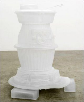 Joseph Grigely relève également un autre article de presse, où l’on perçoit deux hommes assis sur un seau posé sur la glace du lac du Michigan. L’un d’eux confie au journal: «Les gens pensent que nous sommes fous, assis sur des blocs de glace. Mais se relaxer et discuter ici, c’est ça notre vie». L’artiste reproduit alors ses deux seaux, symboles de conversation et de convivialité, à partir de résine translucide. Ce même matériau est utilisé dans We Need a Drinking Song, sculpture représentant un poêle à bois, et évoquant un lieu de chaleur, de proximité et de fraternité, avec des partitions aux murs retranscrivant des chansons populaires à reprendre en chœur.