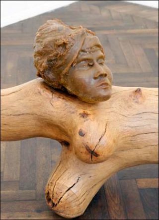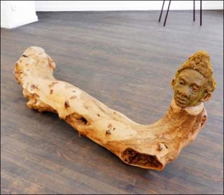 Pour son exposition «Alma-Bluco» au Crac Alsace, à Altkirch, Musa paradisiaca a sélectionné cinq troncs d’arbres, qu’il coiffe de têtes anthropomorphes en colle animale. «La découverte de leurs formes résulte d’un processus de recherche intense autour, non seulement des qualités de ces entités mais aussi de leurs nécessités individuelles d’exister comme des choses vivantes», relatent les deux artistes. Tomé Coelho a soigneusement nettoyé les zones pourries du bois pour en révéler ses formes inaccessibles. «Au lieu d’obliger ces troncs d’arbres à être quelque chose, nous devions peu à peu accepter qu’ils devenaient quelque chose de leur propre gré. Ces portraits sont aussi le résultat d’un dialogue constant. Faire ces sculptures consistait d’abord à parler d’elles.»