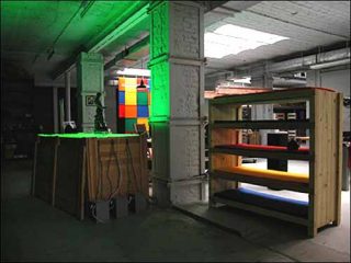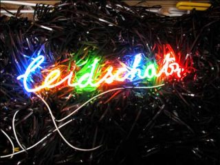 — Leidschatz, 1992-2007. Installation. Caisse dorée type caisse d’oeuvre avec néons cassés, bandes magnétiques, néon rose, transformateur. Collection de l’artiste.