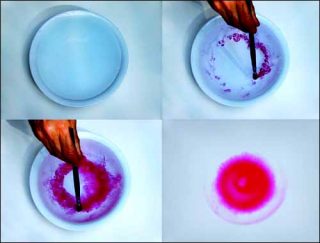 En lieu et place de la vidéo attendue du Cri de Munch, est projeté un film réalisé par Sarkis, Au commencement, l’œil de Munch. Un pinceau, trempé dans une aquarelle rouge, plonge sa pointe dans un bol d’eau: les filets de couleur s’assemblent en cercles concentriques. Les volutes initiales constituent progressivement l’image d’un œil, et reprennent les ondes qui ébranlent le tableau de Munch. L’œuvre n’ayant pu être filmée, Sarkis montre directement l’image qu’elle a produit sur son œil, indélébile.