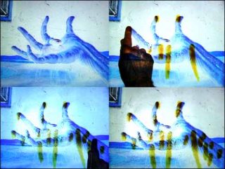 — Au Commencement, Le Toucher, 2005. Installation vidéo, 6 vidéo couleur, écran, lecteurs, bois de tilleul. Collection Fnac.