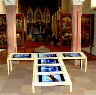 Une grande installation vidéo fait écho au Retable d’Issenheim, reprenant sa forme cruciforme. La main de Sarkis, trempée dans de l’aquarelle jaune comme du miel, touche du bout des doigts le corps du Christ reproduit sur du papier, stigmate par stigmate.
