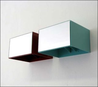 Avec Philippe Million le retrait n’est pas du côté du monde mais des choses. Designer, il conçoit des objets dont la fonction n’est pas immédiatement visible et qui, de fait, troublent la perception. Ici, Étagère (orange), Patère 5 crochets (rouge) et Patère 1 crochet (brun), présentent des formes derrière lesquelles s’éclipse la fonction. Difficile de déterminer l’usage de deux boîtes fixées au mur et recouvertes de miroirs, ou encore, d’une sorte de banc composé de barres en fer. Il s’agit en réalité de deux portes manteaux et d’une étagère.