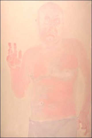 Les peintures de Luc Andrié visent, quant à elles, une moindre présence, une matérialité réduite au minimum pour une infime vibration. L’une d’entre elles, L’Homme blanc n’a plus de peau «2008 (30)», laisse émerger sur un fond beige un homme quasiment nu. Comme à l’arrière d’un verre opaque, on ne perçoit que très légèrement sa chaire rose vif. Il semble nous faire signe avec son bras levé et son regard perdu. Mais, sa corporéité fantomatique nous sépare à jamais de lui.