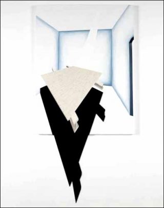 Dans Hollow, l’ombre d’une structure flottante est dessinée en trompe l’œil, et l’œuvre semble sortir de son cadre. Nouveau jeu de dimension où l’œuvre s’invite dans l’espace du spectateur.