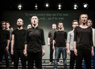 Aujourd’hui, ces textes retranscrits à travers la force d’un chœur, que Marta Górnicka qualifie de «post-opéra», une machine composée d’un corps et d’une voix collectifs, frappent avec une incroyable puissance. Le langage, scandé, y est à la fois désigné comme l’un des principaux outils de ce formatage et transfiguré par le travail qu’il imprime sur les voix et les corps ainsi que par la musicalité qui s’en dégage. Un chœur énergique et révolté qui impressionne par son intensité physique et par la virtuosité avec laquelle ces travailleurs du verbe transforment les mots en musique et le langage en rythme. Le potentiel révolutionnaire des poèmes des années 30 résonne comme un chant à la gloire de l’efficacité et du rendement d’une corporation.
