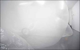 L’installation Respiration est spectaculaire. Des bulles blanches en plastique translucide gonflent alternativement jusqu’à remplir l’espace de la galerie et s’affaissent mollement. Le mouvement répétitif et irrégulier est obtenu grâce à des ventilateurs qui soufflent alternativement et ronronnent légèrement. Les sensations sont très physiques. Alors que les bulles se touchent, se gênent mutuellement et cherchent leur place respective, notre souffle se calque sur cette respiration artificielle et ainsi les deux vibrent à l’unisson.