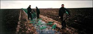 — Chaussy, domaine de Villarceaux, ferme de la Bergerie, ouvriers forestiers replentant des haies, 2001. Tirage lambdachrome contrecollé sur aluminium. 90 x 242 cm.