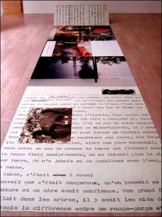 — Ruban pour Bruno Esnault, enfant de l’îe de Chatou, 2003. Témoignage de Bruno Esnault recueilli et typographié par Martine Delahaye (1988). Photo de plateau d’Eli Lotar (DR), tournage de Une partie de campagne de Jean Renoir (1936) rephotographiée en transparence des pages 23-24 de l’ouvrage de Henri Cartier-Bresson, Premières photos (Arthaud, 1991). Henri Cartier-Bresson, Les Yeux ouverts et Georges Bataille Les Yeux fermés; Photo de l’installation Méandres, Objet oublié dans une image : ma canne à pêche de modèle Empire, expo. « Des territoires » (Ensba, 2001), incluant une photo de la guerre d’Indochine de Pierre Ferrari (Ecpa); photo d’une plaque sérigraphiée du tableau d’Auguste Renoir, Les Canotiers à Chatou (1881), sur le chemin des impressionnistes, île de Chatou (2002).