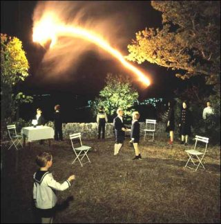 Bernard Faucon se représente lui-même, ses lieux familiers et ses proches; la coïncidence est encore possible avec sa propre image dans un ordre naturel et familial où sa place ne pose pas problème. Mais les couleurs irisées, qu’on retrouvera par la suite, soulignent déjà la conscience d’une distance entre soi et soi-même, et entre soi et le monde. Elles indiquent aussi le sentiment d’une présence invisible et mystérieuse par-delà «ce qui est» et qui tremble dans la menace de sa disparition. Silence donc sur cette période dans le titre de l’exposition, comme pour soustraire au cours du temps ce «Temps d’avant».