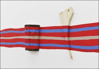 Avec The Dark Whatever, le style naïf de ces personnages croise directement des références à la peinture populaire africaine. Plus loin, on découvre Maintenant: une main s’accroche aux bandes rayées d’une peinture murale qui court sur toute la longueur d’un mur de la galerie en passant par-dessus des morceaux de bois, comme dans un épisode de Tex Avery, lorsque le loup court et traverse le bord de l’image, la frontière du film. Pour Genêt Mayor, l’abstraction est une pente glissante, qui offre des visions pleines de ressources.