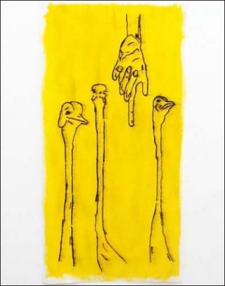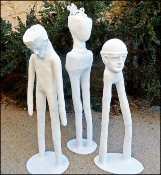 Dans la seconde salle de l’exposition sont réunis plusieurs dessins réalisés au fusain et à l’acrylique sur toile (série LSD). Entre réel et surnaturel, figures humaines et animales, ces dessins représentent des scènes fantastiques qui pourraient être issues de fables, de contes ou d’hallucinations. Enfin, trois sculptures appartenant à la série Everyday Robots sont installées à l’extérieur de la galerie. Ces sculptures blanches représentent des céphalopodes humains: leur tête proéminente étant directement liée à leurs jambes, ces êtres sont réduits à leurs facultés de penser et de se déplacer.
