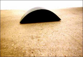 Les sculptures qui occupent la pièce principale de la galerie étaient encore inédites en France. Elles se présentent selon des formes géométriques simples — parallélépipède rectangle, colonne rectangulaire, portion de cylindre, etc. —, noires, blanches ou couleur aluminium. Tout pourrait laisser supposer la présence d’une esthétique minimaliste dans ces formes posées à même le sol, ou sur le mur pour l’unique tableau monochrome, à deux détails près : la texture des matériaux, la finition des surfaces, ne conduisent pas à la pureté qui résonne dans le minimalisme et surtout, un phénomène étrange saisit le spectateur à leur abord : les pièces se déplacent imperceptiblement dans l’espace, elles suivent des trajectoires aléatoires, traversent le lieu d’exposition et en fonction des obstacles rencontrés, repartent dans une autre direction, non moins aléatoire.