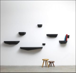 Sculptures ou objets fonctionnels, le doute s’insinue car certaines formes semblent faire référence aux coques de bateaux qui ornent les cabinets d’amateur de sports nautiques, d’autres viennent s’échouer comme des banquises, dans une prolongation logique du paysage stratifié de la table basse Rizière de 2007. Il s’agit cependant bien d’étagères !