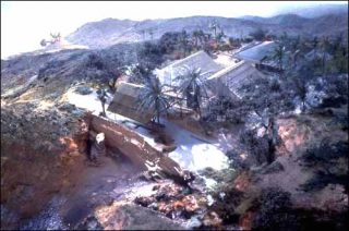 Plus accessible sans doute que l’île déserte édénique, la maison individuelle devrait rencontrer un succès tout aussi consensuel (Postmodern). A l’écart de tout voisinage, son style indéfinissable procède du conglomérat éclectique des poncifs de l’architecture occidentale, cimentés par une facture toc digne de Disneyland. Une 4×4 rutilante, des jeux d’enfants tout droit importés d’une aire d’autoroute, et de jolis rochers de jardins miniatures japonais, achèvent l’accomplissement d’un supposé rêve moyen (de la classe de la même catégorie). Mais le malaise vient de là : dans une lumière laiteuse, si éloignée des couleurs saturées du papier glacé des magazines qui modèlent les aspirations consuméristes, s’assemblent des éléments épars du réel bien réel, le nôtre, ici et maintenant, pour engendrer un véritable cauchemar esthétique. Et, comble de la désolation, alors que le pavillon est à peine achevé, le malheur est déjà survenu. Un tank d’une force onusienne stationne devant la maison qui a été mise à sac (Postmodern II).