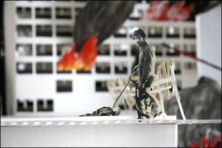 Dans un tout autre registre, Lamia Ziadé représente dans une maquette en 3D des bâtiments agrémentés de laine et de dentelle qui font écho au travail de l’artiste. Elle met en scène ici sa représentation de la guerre du Liban.