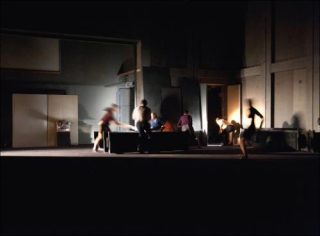 Sur le plateau, rien ou si peu. Des planches empilées de part et d’autre, des ouvertures entre les cloisons noires, des squelettes d’estrades. La lumière est pleine sur scène et dans la salle. Un homme entre, vêtu d’un pantalon sombre et d’une chemise blanche, anonyme. Il tire un fil invisible, le déroule, le dénoue, en jauge la solidité. Une femme le rejoint et ils seront bientôt sept à prendre en main les fils qui tissent nos existences, à les perdre et les retrouver, les rompre et les renouer.