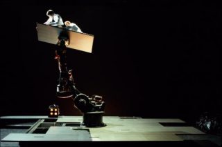 Tout au long de ce voyage immobile en douce poésie spatiale plutôt qu’en réflexion technologique, le robot est parcouru de gestes. Les corps des hommes et du robot agissent en harmonie. Le bras articulé connait la vitesse et l’ivresse de la lenteur. Infiniment précis, il peut convoquer la lumière et la faire danser sur un miroir, refuge des petits hommes. Il se joue de l’apesanteur et des normes d’échelles. Monumental lui-même, il peut agencer les plaques déconstruites de l’estrade en immense sculpture verticale, reflet mécanique de l’Å“uvre de Richard Serra. Dans le même temps il peut accueillir les corps infiniment petits des interprètes et les mettre en valeur. Comme au cirque, le public s’émerveille de son agilité, tremble de possibles chutes et s’amuse de passes burlesques.