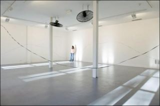 Zilvinas Kempinas présente une installation Airborne (2008) déclinée de l’appareillage vidéographique dont il n’a conservé que la bande magnétique sous la forme un cercle vide, aussi grand que la salle d’exposition, soumise à l’activité de deux ventilateurs suspendus au plafond.