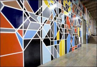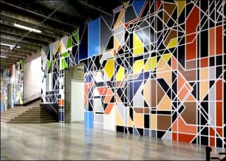 Les plans de couleurs se transforment en complexes habités par l’animation quotidienne mais ne se montrent en fait que comme des surfaces de respirations immobiles. Lacérées de part en part, elles s’inscrivent dans le site peint et nous entraînent elles aussi dans la course effrénée qui se joue ici. Cette géométrie inextricable transforme l’entrée du musée. Elle désoriente le visiteur pour le guider vers un ailleurs abstrait à vivre autrement, de l’intérieur.