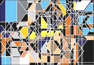 Peintures abstraites : le paysage urbain prend des allures de diagrammes aux lignes brisées et aux intersections multiples. Les aplats d’acrylique brillants sont traversés par des lignes blanches mates. La lumière s’accroche différemment sur l’étendue polychrome.