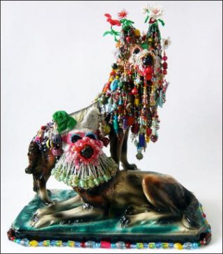 Mais à côté de ces pièces aux formes épurées, ce sont les complexes compositions aux accents kitsch et outranciers comme A Light Beyond Darkness, qui attirent l’œil. Leur réalisation peut demander deux à trois ans de travail à l’artiste. Là , c’est l’accumulation qui fascine. Non pas par le chaos qu’elle pourrait susciter mais par son ordre structuré qui apporte rythme et densité à la forme. L’utilisation récurrente de paillettes ou perles de verre et de plastique, quant à elle, habille l’ensemble de mille feux.