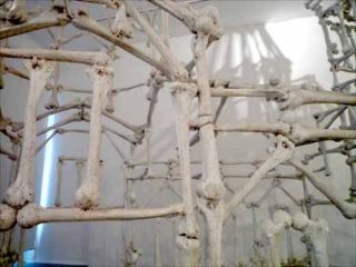 En matière d’univers différents et d’échelles de temps, la basilique Notre Dame des Os est un squelette narratif: réaliser une basilique d’os (en résine polyester) sur une armature métallique, rappelle les chefs d’oeuvre des compagnons du devoir, eux mêmes héritiers des bâtisseurs de cathédrale. Située sur un piton calcaire de 162 mètres, Notre Dame est une statue monumentale de 11,2 mètres toute en cuivre dorée. Au Centre d’ art, Notre Dame des Os projettera son ombre sur le mur, comme une sorte de point d’encrage. Avec à son sommet, la vierge à l’enfant-symbole de la chrétienté, Nicolas Rubinstein nous en présente une radiographie modifiant notre perception, dévoilant sa structure, ses articulations. Mise a nu, débarrassée de son vernis culturel : voici tout ce qui reste de cette grande épopée humaine destinée à conquérir la terre, les cieux et les esprits … Qu’il s’agisse de trophées, de cartes ou de monuments, Nicolas Rubinstein navigue aisément entres les époques, explore nos mythes et interroge notre devenir.