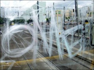 «Scratches», corpus d’images photographiques réalisé à Berlin en 2009, manifeste de ces accumulations d’inscriptions codées, d’acronymes, gravés par des anonymes dans les vitres des transports publics qui circulent jour et nuit dans toute la ville.