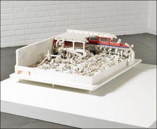 Sans titre de Didier Marcel est la maquette d’un ancien garage. Cette pièce de 1992 est la première de la série des «démolitions». Inversant le principe normal d’une maquette, l’œuvre est la modélisation d’un bâtiment en cours de démolition. Figurant une ruine, la maquette ne peut évidemment pas être comprise comme un projet; sa temporalité n’est pas celle de la projection dans l’avenir, mais du rappel, de la commémoration. En réemployant des déchets extraits de la poubelle de son atelier pour figurer les gravats de la maquette, Didier Marcel joue sur le caractère transitoire et recyclable de ce genre de constructions.