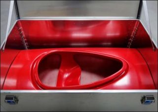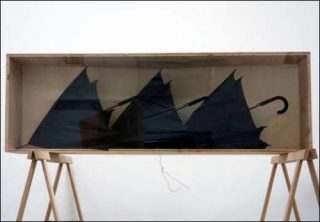Autrefois suspendus dans les airs, projetés depuis un hélicoptère en plein vol, les plus fidèles compagnons de route de l’artiste se retrouvent étrangement conditionnés comme de précieux souvenirs: un trio de parapluies dont l’ouverture semble contrainte par la boîte qui les contient, un morceau de kayak préalablement découpé et disposé dans une caisse en aluminium. Devant cette mise en boîte, la tentation analytique est grande. Réflexion rétrospective et nostalgique? Clins d’œil ironiques?