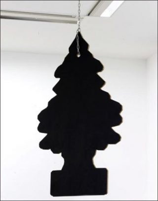 Il y a d’abord les sculptures malicieuses, celles qui font tressaillir l’image du réel, déformant ses échelles, ses volumes, ses matières quelque peu, juste assez pour qu’émerge le doute. Ainsi celle de Bruno Peinado figurant un diffuseur de parfum — ce sapin que l’on accroche au rétroviseur des voitures — dix fois plus volumineux que la normale, sans odeur, suspendu, effrayant et inutile, au plafond de la galerie.