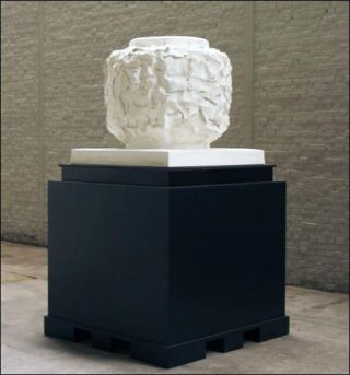 L’artiste s’est attaché à tirer parti de la configuration des lieux en choisissant deux ensembles pour les deux salles qui, en contrebas l’une de l’autre, se font face. Dans la première, la salle haute, seront présentées, pour la première fois en France, neuf grandes pièces, qui constituent le travail le plus récent de l’artiste (2007-2010) autour des sculptures intitulées Etude pour la Pierre et Etude pour l’Urne. Le second espace rassemblera un groupe de sept sculptures en plâtre, celles qu’on pourrait nommer «sculptures retournées» (1995-1999), ainsi qu’une série de 32 photographies en noir et blanc réalisées dans l’atelier en 1998, à partir d’une Å“uvre datant de la même époque (Cariatide à la pierre, 1997). Car la photographie joue aussi un rôle important dans l’œuvre de l’artiste. Par le jeu de la lumière et du mouvement, on se fait constamment une autre idée des Å“uvres et chaque image photographique en présente une nouvelle facette figée dans le temps. Dans cette série, intitulée Profils. Cariatide à la Pierre, Didier Vermeiren a photographié sa Cariatide à la Pierre après lui avoir impulsé un mouvement de rotation, plus ou moins lent, en laissant le diaphragme de son appareil ouvert. Ce n’est plus le spectateur qui tourne autour de la sculpture mais la sculpture qui tourne sur elle-même, saisie comme en lévitation.