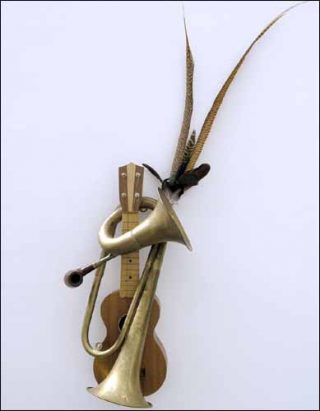 — Gavotte, 2008. Laiton, bois, plume. 100 x 30 x 24 cm.
