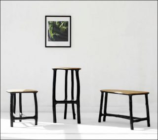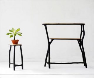 La collection Fall/Winter comprend une série de mobilier aux dimensions, structures et usages différents. Bien que variées en tailles et dispositions, toutes les pièces partagent une signature commune, avec un piétement en noisetier assemblé par tenons et mortaises à un plateau de chêne. Un mélange de sciure et de résine est utilisé pour enrober ces assemblages et créer une esthétique résolument organique dont toute forme saillante a disparu. Les pièces sont ensuite brûlées et passées à la cire, après quoi le plateau est poncé au sable, poli et traité à l’huile. Les branches de noisetier, choisies pour leur robustesse et leur droiture, donnent à ces structures leur mouvement dynamique et confèrent à chaque objet son caractère distinct et unique immédiatement reconnaissable. Chaque pièce est fabriquée à la main, signée et numérotée.