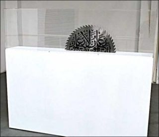 Plus loin des scies sauteuses placées à l’intérieur de vitrines en plexiglas sont recouvertes de calligraphies arabes. La dangerosité des lames associée à la beauté des écritures met en scène les ambiguïtés de la religion, à savoir la tension entre l’appel aux cieux et l’exhortation aux croisades.