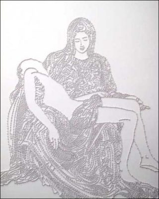 — Mounir Fatmi, Bas-Relief La Pietà , (corps blanc sur fond blanc), 2009. Version 5/5, câble d’antenne et attaches, 255 x 205 cm.