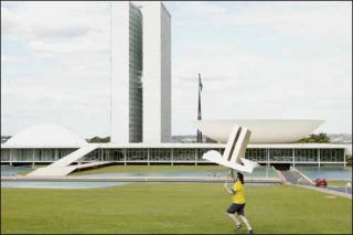 Face à ce témoignage, qui redonne au paysage sa dimension historique et politique, Jordi Colomer revient avec une pièce en huit actes (Anarchitekton), dernier refuge de l’ironie politique paysagère. On y voit un homme courant sans discontinuer au milieu des architectures symbole de la modernité, des immeubles d’habitation et leurs terrains en friche ainsi que le centre-ville de Brasilia porté par l’exubérance des constructions de Niemeyer. Au-dessus de sa tête, comme brandissant une banderole de manifestant, l’homme porte la maquette des lieux dans lesquels il fait ses apparitions furtives. Le matériau pauvre est une nouvelle fois de rigueur, cette fois-ci pour servir la cause du contre-pouvoir.