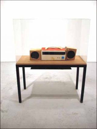 Face à l’entrée, dans la pièce à part, Jordi Colomer installe un transistor comme il exposerait une sculpture précieuse (Le Dortoir, bande-son, 2002). Là , sous une vitrine de musée, l’appareil aurait presque fière allure, tout près d’une consécration artistique, enfin libéré du carcan qui le retient dans le cycle mercantile. Si ce n’était son mode de fabrication particulier à partir de cartons et d’autres éléments de récupération (un bouchon de bouteille en guise de bouton de volume, par exemple).