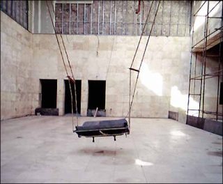 Le monument disparaît ainsi sous le ridicule, l’électroménager familial comme symbole du culte du progrès moderniste ne résiste pas au fracas de l’artiste. Postulant ready-made, l’appareil n’est que l’ombre de lui-même: objet sans fonctionnalité, sculpture sans qualité, il n’accède à aucun statut d’envergure. Et c’est précisément ce qui intéresse Jordi Colomer, ce moment où le degré zéro de la représentation cède le pas à l’interrogation sur la posture de l’œuvre dans la société contemporaine, moment où l’on regarde l’objet non pas pour ce qu’il est mais pour ce qu’il tente de nous dire. La malice de l’artiste va jusqu’à introduire une source sonore sous l’appareil, manière de travestir une dernière fois son installation.