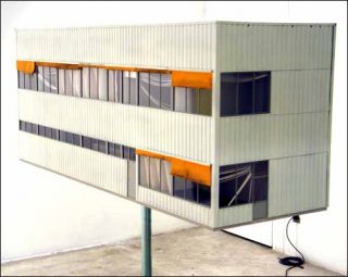 — Jordi Colomer, Le Dortoir, bande son, 2002. Carton, bois, plastique, matériel électronique, disque-compact. 142 x 113 x 53 cm.