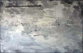 Explorateur du monde, Sen Chung parle de mythologie, de contes et d’objets du quotidien, qu’il traduit par une écriture jetée sur la toile avant d’y être submergée, engloutie et apaisée.