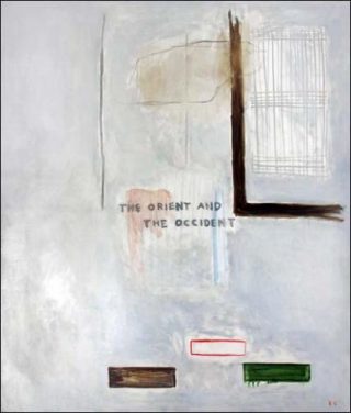 Un ensemble de toiles dans lesquelles il introduit quelques mots ou phrases pour accompagner et rendre visible son questionnement. «The Orient and the Occident», «Vision of youth to the serenity of old age», «summer- winter».