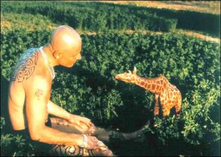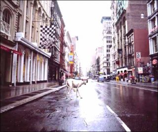 Sur les murs de la galerie, des photographies en couleur nous montrent une bande d’amis de l’artiste, tatoués, grimés, emplumés, jouant aux Indiens. On peut aussi voir les œuvres en vidéo sur deux petits écrans et un grand où les images passent en boucle. On retrouve la performance des amis grimés, les dromadaires de Marrakech, et l’artiste en patinette, à quatre heures du matin, dans le métro de New York. Dans sa course, il croise au hasard quelque caniche ou lévrier sculptés ou encore quelque bon bâtard, bien réel cette fois, qui renifle, déconcerté, ses faux frères. Les sculptures (car ce sont des sculptures) sont réalisées à partir d’une ossature en fil de fer, étoffée de mousse expansée, recouverte de moquette, de chanvre, de poils et de résine. L’œuvre est signée, marquée «au fer» du logogramme «F».