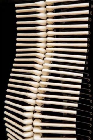Le travail de Noëlle puise sa source dans sa pratique de restauratrice. Il s’appuie sur son amour de la maîtrise technique, artisanale, sa connaissance des propriétés de la matière et son désir de retrouver dans l’Å“uvre la trace du geste de la fabrique. Prendre la feuille de métal carrée comme module de base. Décliner ce module suivant les rythmes et les formes (pleins/vides, carrés/lignes) sur un support préparé suivant les techniques anciennes (poses successives du gesso di Bologna et de la colle de peau de lapin, ponçage, passage de la gomme-laque).